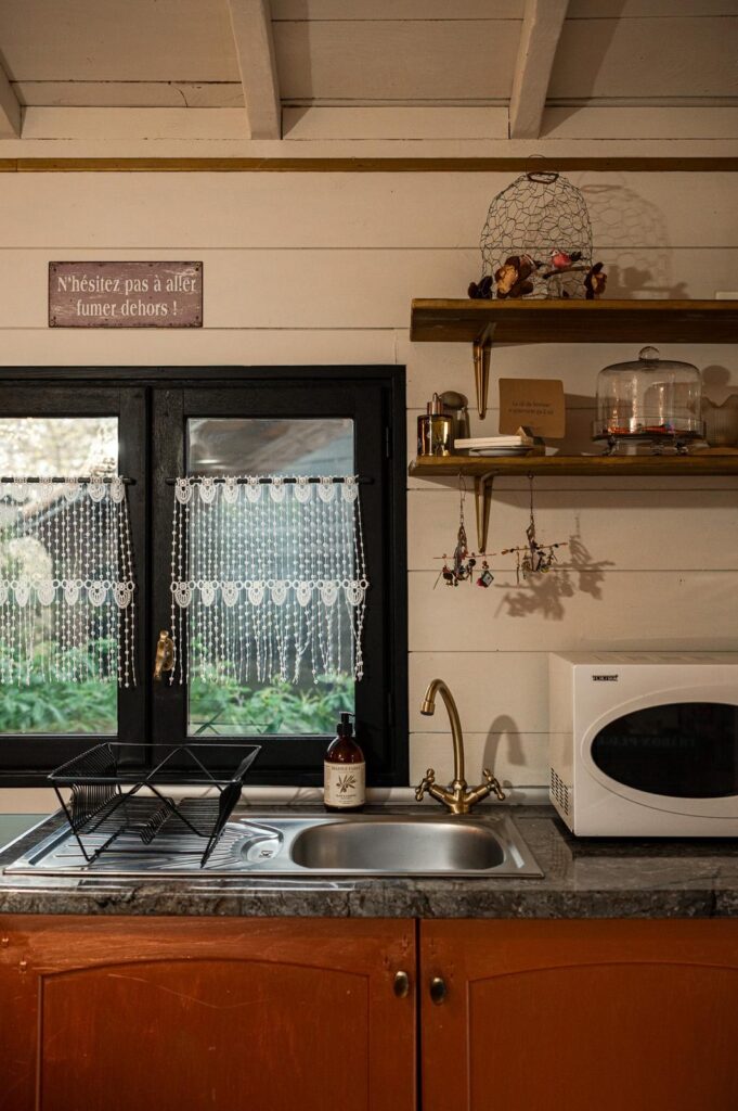 Un grand lit en 140 qui est au centre de ce petit cocon. Le charme de ce lieu en fait un espace réservé au bien-être avec un coin équipé d’une baignoire pour un moment de détente absolu et vous disposerez d’un coin toilettes privatives à l’intérieur. Bouilloire, cafetière et petite vaisselle pour prendre le temps d’un thé. Chauffage. Salon de jardin